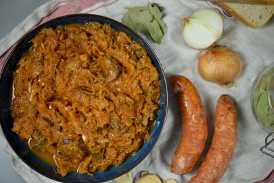 Add sauerkraut, mix, cover and cook for another 1.5 hours. Best if cooked again (for about 1 hour) the next day.
